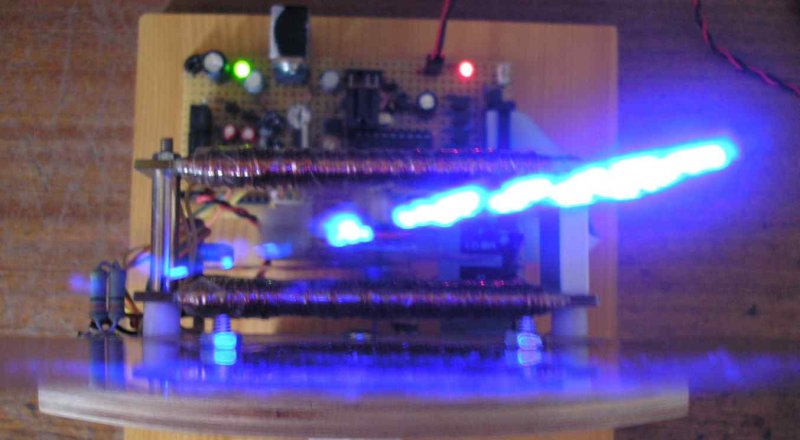 Elkészült az újabb 8 pontos kar, de ezzel sem vagyok megelégedve. Valami oknál fogva "ferdén" rezeg a párhuzamos sík helyett. Cseréltem mágnest, forgattam, állítgattam minden mechanikai lehetőséget megvízsgáltam, de hasztalan. El nem tudom képzelni mi lehet a baja, pedig jónéhányat készítettem már hasonlót. Visszaraktam az előzőt, azzal legalább megyen síkban a rezgés. (Nem szabad ennyire precizen megcsinálni, mert mégannyira sem lesz jó.) Kék 0805 méretkódú LED-ekkel szereltem, és a keretet két vörös 0.8mm széles spéci LED alkotja. Ilyen LED-eket már 1mm távra lehetne rakni egymástól, ahol igen kis méretben is elkészülhetne a kijelző. Egyszer csinálok a miniatür Wand-ot. Néhány felvételt feltöltök, szia.