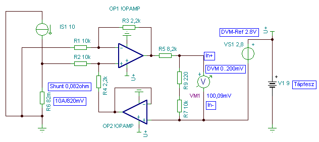 Megoldás lehet azonban a mellékelt ábra, mely a shunt ellenálláson eső feszültséget, mintegy átkonvertálja az AGND ponthoz képest. A shunt lehet az az ellenállás is amin az áramfigyelés folyik. Ennek értéke 0,082 ohm a rajz szerint. Ha azon 10A folyik, akkor azon 820mV feszültség esik. Nekünk, ebből csak 100mV-ra van szükségünk, tehát az áramkör csillapítani fog. A különbség vonó erősítő erősítése 2,2kohm/10kohm=0,22 Tehát annak kimenetén a 820mV-ból már csak 180mV lesz, ezt a kimeneti feszültség osztó tovább osztja. Így a 820mV-ból pont 100mV lesz a műszer bemenetén.