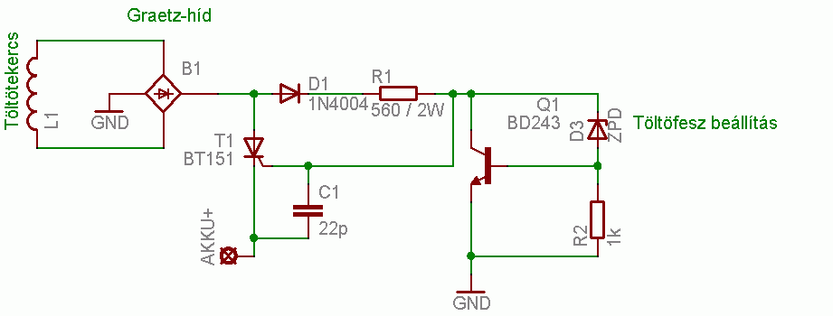 Nem, mert a PNP tranyós hibás kapcsolás. Ez egy Shunt stabilizátor a maga nemében. Tehát a zénernek, a kollkltor-bázis között van a helye. Ha a kollektor-emitter feszültség meghaladja a zéner+tranyó BE feszültségét, a tranyó kinyit és vezetni kezd. Ezért a kollektor feszültség nem tud tovább emelkedni. De a tirisztoros kapcsolásban, még a tirisztor gate feszültsége (kb. 1V) levonódik a "satabilizátor" feszültségből. (Az előzőleg feltett szabályzó rajzod még szerintem hibás. A "nagy" diódánál, sem biztos, hogy jól nézted ki a katódot és az anódot. Az sem ártott volna, ha berajzolod, mi hova megy a motornál.) üdv! proli007