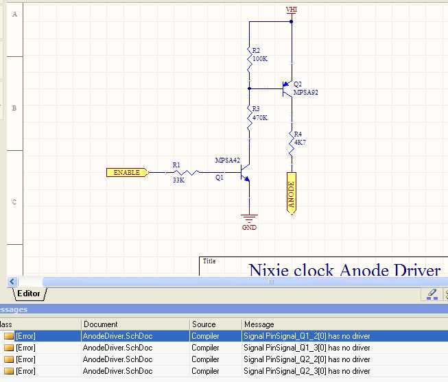 Tudom h a 74141-nek kell driver (mcu pin mondjuk..), de mivel egy nyákra rakom a nixiket meg a 74141et, másikon lesz a proci meg a többi cucc, ezért egy csatlakozót kötök a 74141re ezen a panelen. erre ez itt hibának veszi nekem :S ilyenkor mi van? h lehet kivédeni ezt ? a másik meg hogy a tranyó bekötésre miért panaszkodik az anód driver áramkörben ? nagyon nem értem én ezt.. hol a hiba, h javítsam ? Edga'r