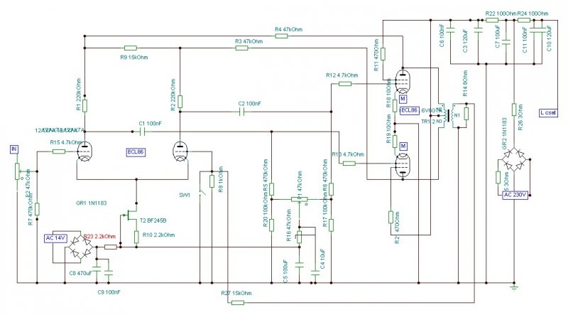 Idézet: „Azt a -10V-ot úgy mértem a rácsnál, hogy a P2 potméter is középállásban volt. Holnap majd megmérem úgy, hogy a P2-t 0 Ω-ra állítom.” úgy akkor jó a 10 V, ha P2 bemenetén volt a 18 V. P2-t rövidzárba kell tekerni először. Ha jó a csöved, bedugásra nem illene leesni a rácselőfesznek, mert az annak a jele, hogy folyik rácsáram.