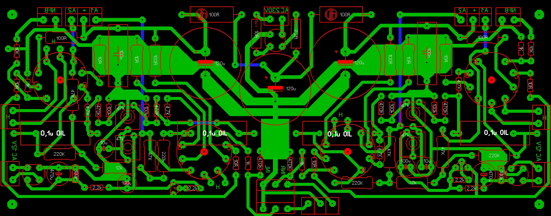 Jól van az úgy, az anódoldali visszacsatolást aztán a 220 K-k végeit összekötő 15 K-s (nyákon 12 K-s) ellenállás balanszíroza, ezáltal szimmetrikusság felé is viszi az egész erősítőt (ha jól értelmezem...).