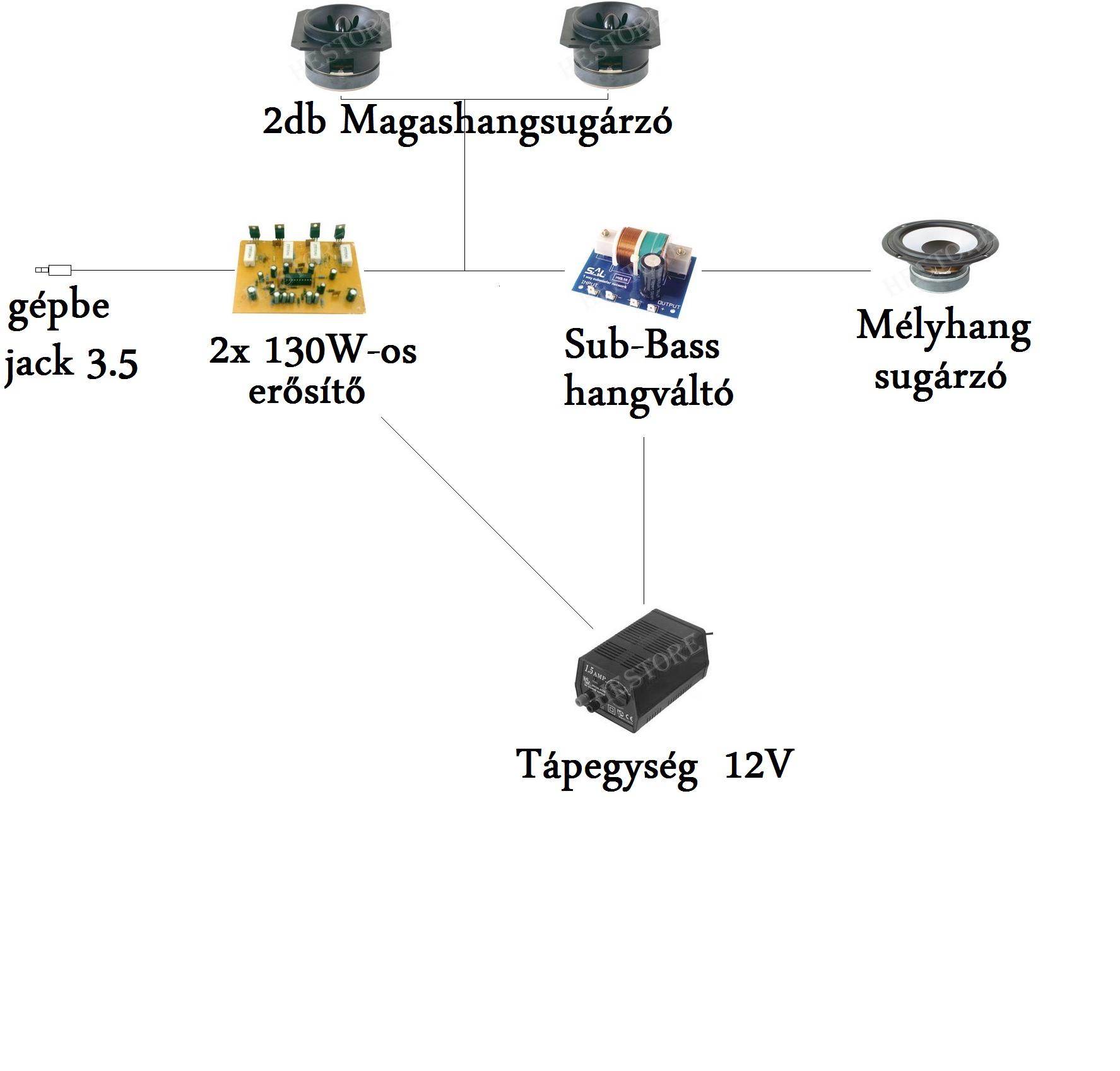 Egy hangrendszert, elég, ha 2.1-es, legyen benne mélyhangsugárzó, 2 magashangsugárzó, 1 stereo kivezetésmérő, egy grafikus hangszín szabályzó, és még legyen benne egy erősítő is, és akkor gondolom kell bele hangváltó.