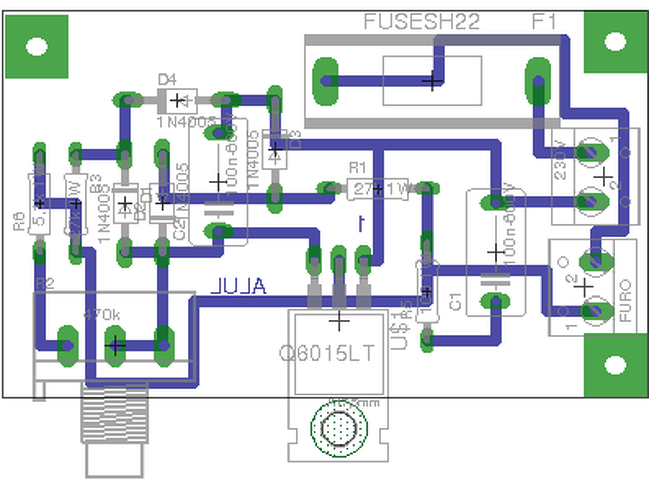 Tegnap este megcsináltam a Bakman-kadarist által javasolt "szimmetrikus hiszterézismentes teljesítmény-szabályozó" NYÁK rajzát,kisebb módosítással: találtam a HQ Videónál egy IC-t, amely egybeépített DIAC-TRIAC egység (lábkiosztása olyan mint a BT136-é) /Q6015LT 600V-15A/