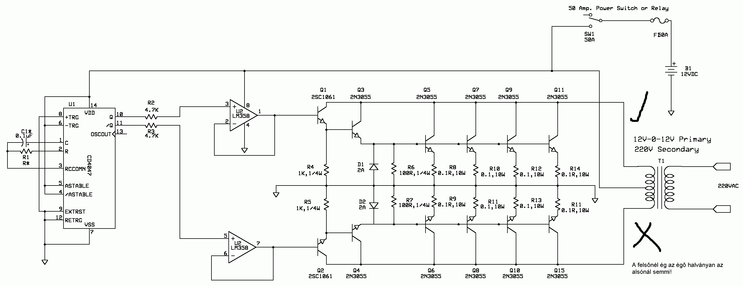 A négyszögjel továbbmeg a műveleti erősítőben ahol a műveleti erősítő már nagyobb árammal képes meghajtani a BD tranyókat. A BD tranyókból darlington kapcsolásban tovább erősödik az áram és a végén a főáram kapcsolgatását elvégzi a 4-4 alsó illetve felső 2N3055 felváltva.