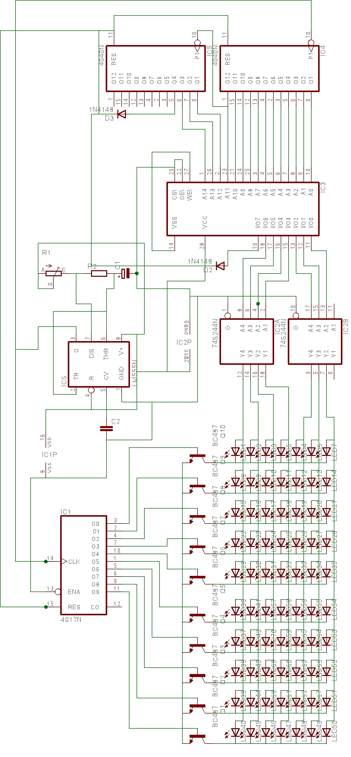 (jah a többi része , Ne555 50Hz-re beállítva (de az se baj ha lehet állítani akkor csak gyorsabb vagy lasabb lesz a kiírás) 4017- ét az oszlopoknak, bináris számláló, EPROM. ) ez hellós dolog durván 400 bájtot foglal el. (512-ben van 64Kb, még bőven fér bele szöveg vagy animáció) van ithon egy 16 bites EPromom is cska azt nemtom hogy hogy programozzam fel