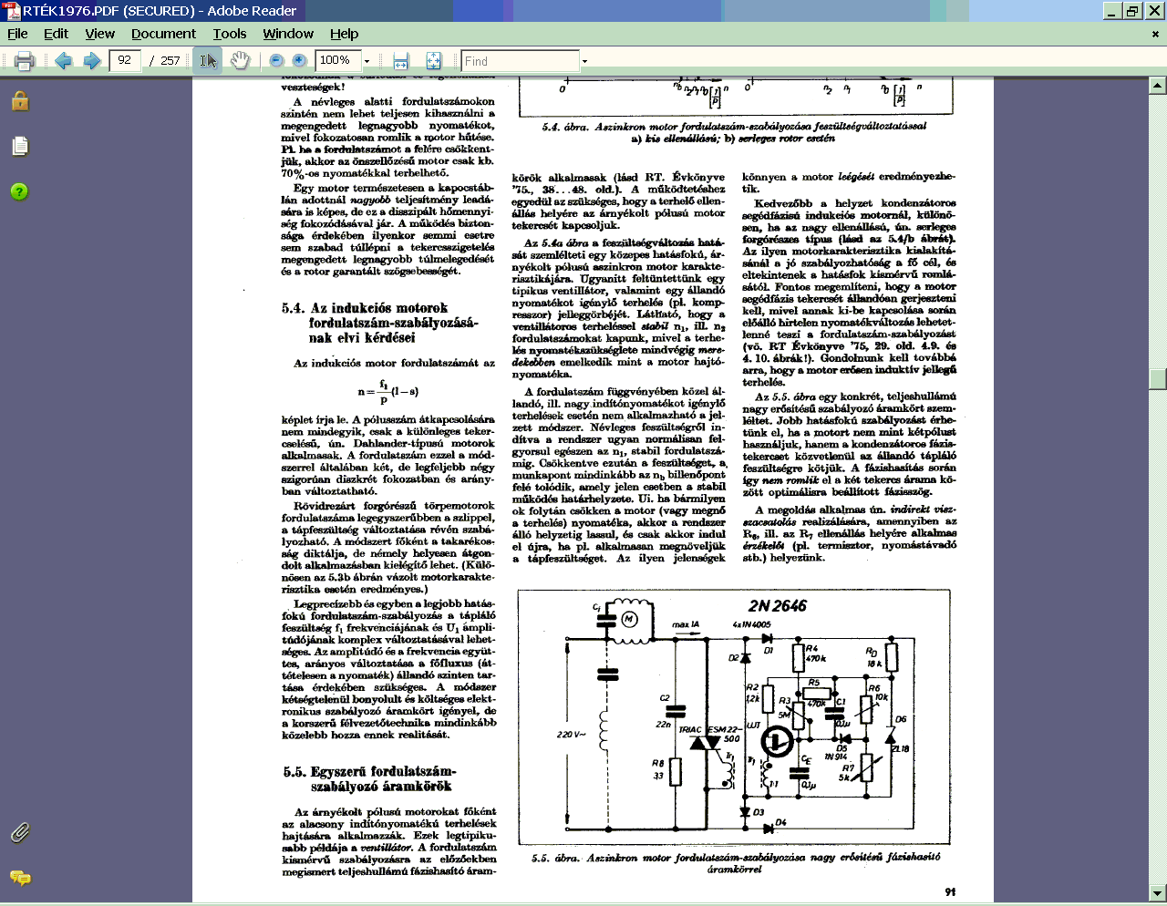 A kis teljesítményű aszinkon motorokat lehet tisztán feszültségcsökkentéssel is szabályozni. Ilyenkor a szlippel szabályozunk. Egy példa a '76-os RT évkönyből.