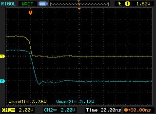 Gyorsan rámértem oszcilloszkóppal. Nyomógombot használtam valószínű azért sok a tranziens. De szépen működik mindkét irányban. A fene jpg-ben kifakulnak a scope bmp képei