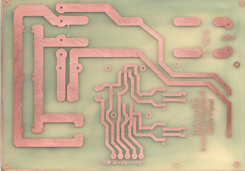 Én egyszerü A4 papirt használlok a fotózásos eljáráshoz. Kétszer nyomtattok ugyanarra a helyre tintasugaras nyomtattóval. És étolajal lekenem a pappirt, hogy átlátszó legyen. Két maszkot csinállok és szerintem elég jó sikerül. Eleinte nekem is lemarta,da a sok világitási idő miatt volt. Most 2 perc a levillágitási idő 6db 15W BL csővel. Valhogy igy néz ki a panel maratás után.