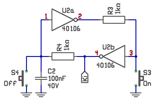 Ha jól értelmezem a vezérlést, akkor ez megfelelhet neked. Ha a bemenetet a +5V-ra húzod kikapcsol, ha a GND-re (0V) bekapcsol. És a hiszterézises inverter úgy is marad, ahogy az utolsó állapotba billentették. Ebben az olcsó IC tokban ebből a fokozatból 6db van. üdv! proli007