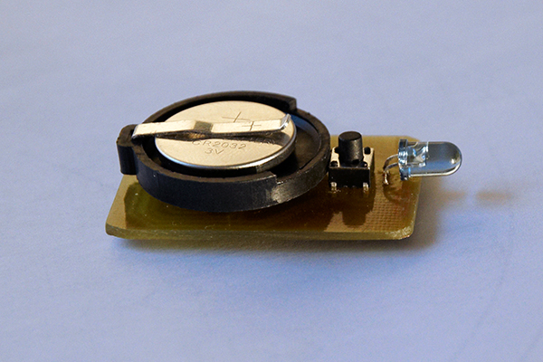 Az elemtartó alulról lesz a panelba forrasztva, a nyomógomb és az infraLED ki lesz vezetve az apró dobozka oldalfalába fúrt lyukakba. A panel kör alakú, és 26 mm átmérőjű.