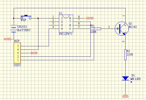 Én úgy csináltam, hogy a tranzisztor kollektor körébe tettem a ledet és az előtét ellenállást, a tranyó (bc337-40) bázisellenállásának 4,7kR-os ellenállást használtam. Meg mint ahogy írtam korábban, nálam csak úgy volt hajlandó egyátalán működni, hogy egy 100nF-os kerámia kondit tettem a PIC Vdd lába és a Gnd közé, gondolom ez a nyomógomb pergését szünteti meg.