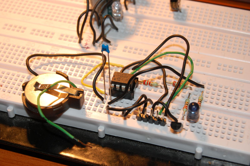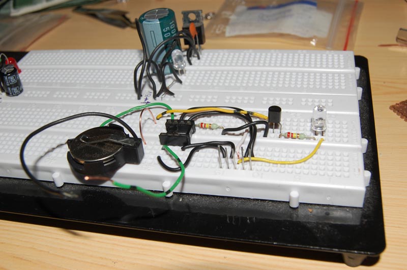 Összedobtam gyorsan az áramkört a dugaszolós próbapanelon, már csak a PIC-re várok, mert ebben a nyomorult városban (Győr) kétféle PIC-et kapsz az Impulzusban, a Si-ker meg 26.-áig zárva...