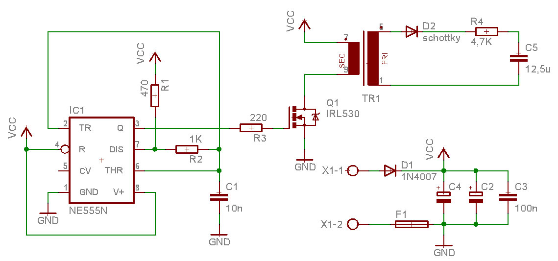 Megépítettem az alábbi kapcsolást, végére rátettem egy pc trafót fordítva.