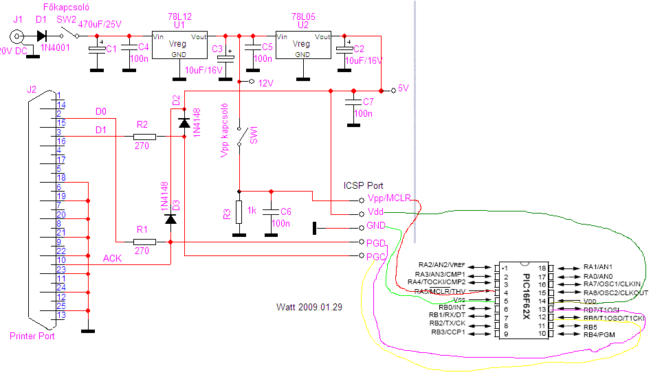 Annyiba változott a helyzet, hogy mostmár föl se ismeri, tehát elszáll. Mivel nem akarok több PIC-et elszúrni, ezért mellékeltem a bekötését, valaki nézze meg legyen szíves, hogy tuti jó-e, mert már kezd kialakuni bennem egy pic-fóbia