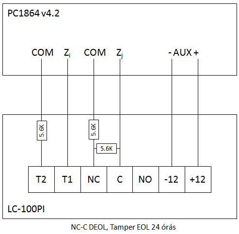 Van egy PC-1864 központom PC-5108 8 zónás bővítővel, amire mindössze 4 db LC-100PI mozgásérzékelőt, egy ajtónyitás érzékelőt, egy PK-5500 kezelőt és egy PS-128/A szirénát szeretnék rákötni. Zóna hely tehát van bőven A 6 és 8 eres vezetékek bent vannak a falban, tehát azzal sem kell spórolni.Praktikus lenne a mozgásérzékelők szabotázsérzékelőit 24 órás felügyelt zónára kötni, arra viszont a Telepítői kézikönyv azt mondja, hogy "Nem használható kettős lezárás Tűz vagy 24 órás felügyelt zónánál". Mivel szeretném az érzékelőket amúgy DEOL lezárással kötni, ezért arra a következtetésre jutottam, hogy minden egyes mozgásérzékelőt 2 zónára kell kötnöm, egy EOL a Tampernek és egy DEOL a mozgásnak. Ezt rajzoltam le és mellékeltem, ez így helyes, érdemes így kötni? Egyébként a 24 órás felügyelt zónáról ezt írja a Telepítői kézikönyv: "EOL lezárású zóna, amely 5600 Ohm ellenállással kell lezárni. A rövidzár nyitott zónát jelent, a szakadás pedig zónahibát eredményez." Ebben azt nem értem, hogy mivel a Tamper normál állapotban zárt, ezért vele sorbakötve az ellenállást (az EOL NC rajz szerint) normál állapotban 5600 Ohm lesz rajta, szabotázs esetén pedig szakadás. Lehet, hogy valamit nagyon nem értek? Előre is köszönöm a segítséget!