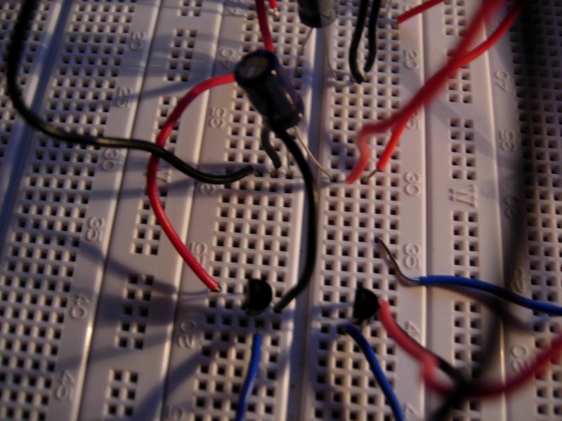 A 150 kOhm melletti ellenállásnak nem egyértelmű a színe. Az barna-fekete-piros (1 kOhm), vagy barna-fekete-narancs (10 kOhm)? Gondolom, a kék negatív vezeték direkt nincs bedugva a tranzisztorok emitterére...