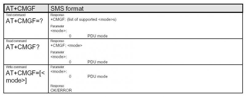 A Siemens AT parancsok között az AT+CMGF az SMS formátumra vonatkozik. Szerintem az Ericsson-nál is ugyanazok az AT parancsok érvényesek.
