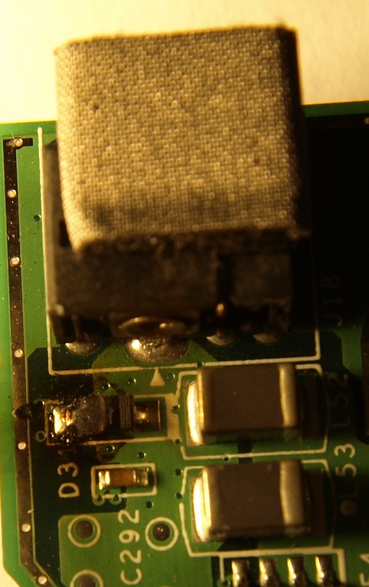 Szétszedés után viszont kiderült, hogy nem a csatlakozó tört el, vagy vált el a forrasz, hanem a közvetlen mellette lévő dióda égett meg. Persze pont annyira sérült meg, hogy már ne tudjak róla semmit leolvasni.