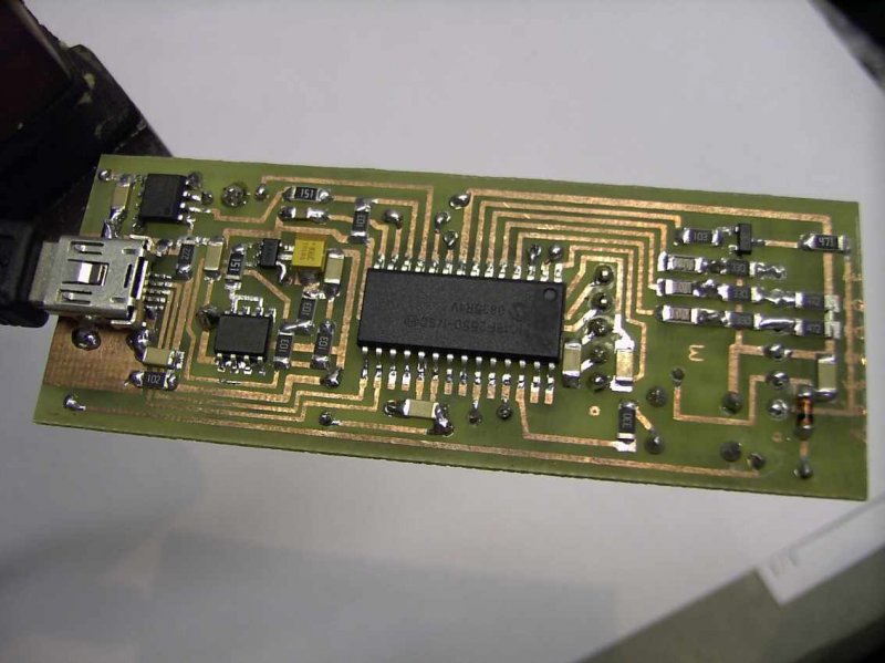 Kicseréltem a 100 nanosnak hitt kondenzátort 10 nanosra. Elég szépen elhaladtam, sikerült a felprogramozás a Pk2V23200.hex-el (újabb verzió). most ott tartok, hogy fölismeri a pickit2, tehát működik a csatlakozás. Van néhány dolog hátra, mint például a ledek cseréje, meg valami normális dobozkát is fabrikálok neki, de majd csak a jövő héten. Addig is csináltam pár képet. /A nyák huzagolásnak semmi baja, csak valamiért nem olyan szép fényes mint a tied, lehet, hogy valami szerrel le kellett volna kezelnem./ üdv!