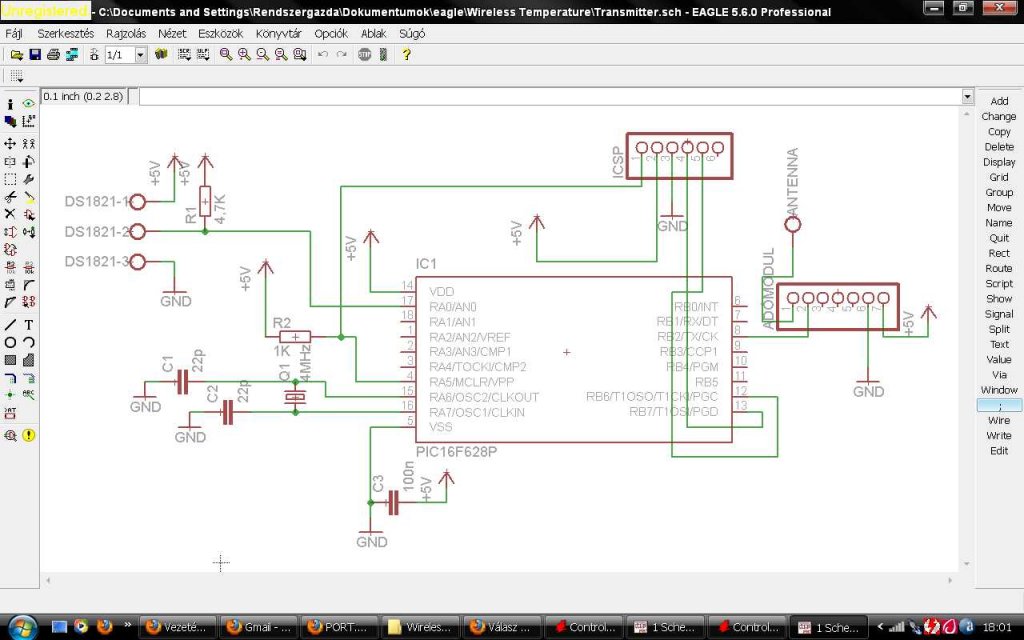 Időközben sikerült rá rajzolni az RF áramköröket, és a DS1821-et, én nem találtam a kapcsolásokban hibát, sokkal nyugodtabb lennék ha valaki nálam tapasztaltabb is vetne rá egy pillantást!