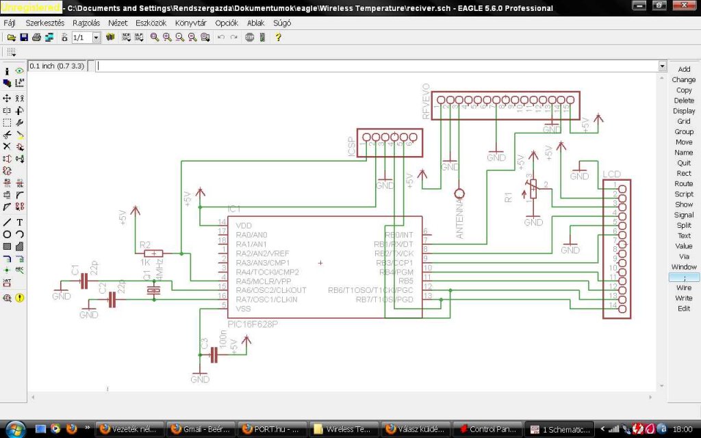 Megrajzoltam EAGLE-ben a vevőt, és az adót, de az RF adót, és a vevőt még nem jöttem rá hova lenne célszerű tenni. Az adó részen pedig a DS1821-et nem rajzoltam még rá.