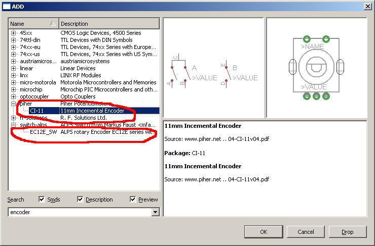 Alkatrész hozzáadásnál beírod, hogy encoder, s a lista alján lesz kettő is. Piher, ill. ALPS. MolnarG, megelőztél.
