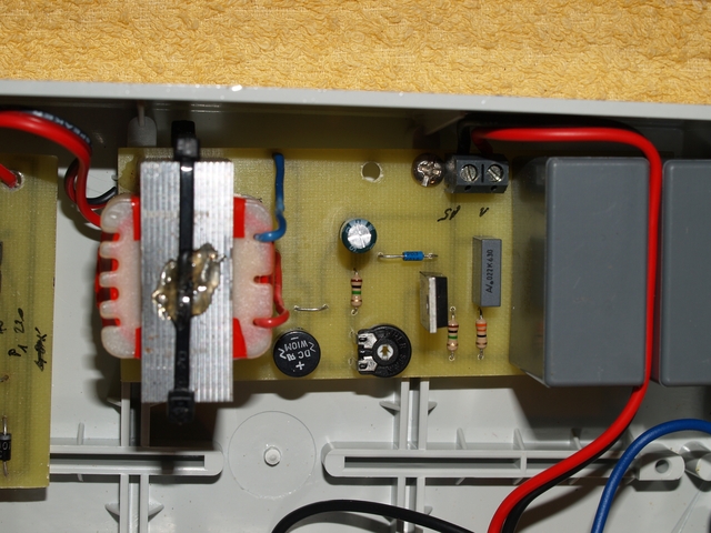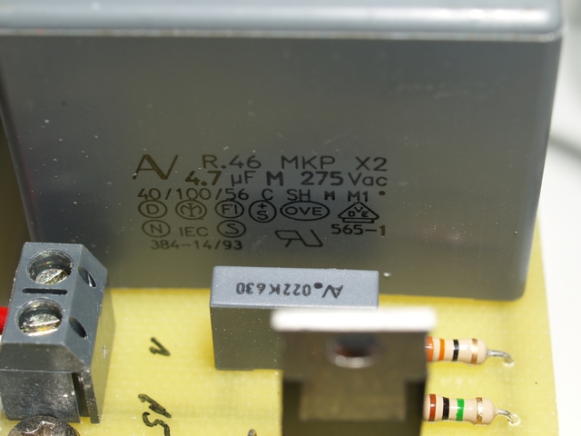 2 db. 4.7 mikrós kondit sütök rá a trafóra, a feszültséget a dugasztáppal szabályzom, kb 250 és 350 volt között. Ha elég a kisebb teljesítmény akkor csak 6 volttal üzemel.