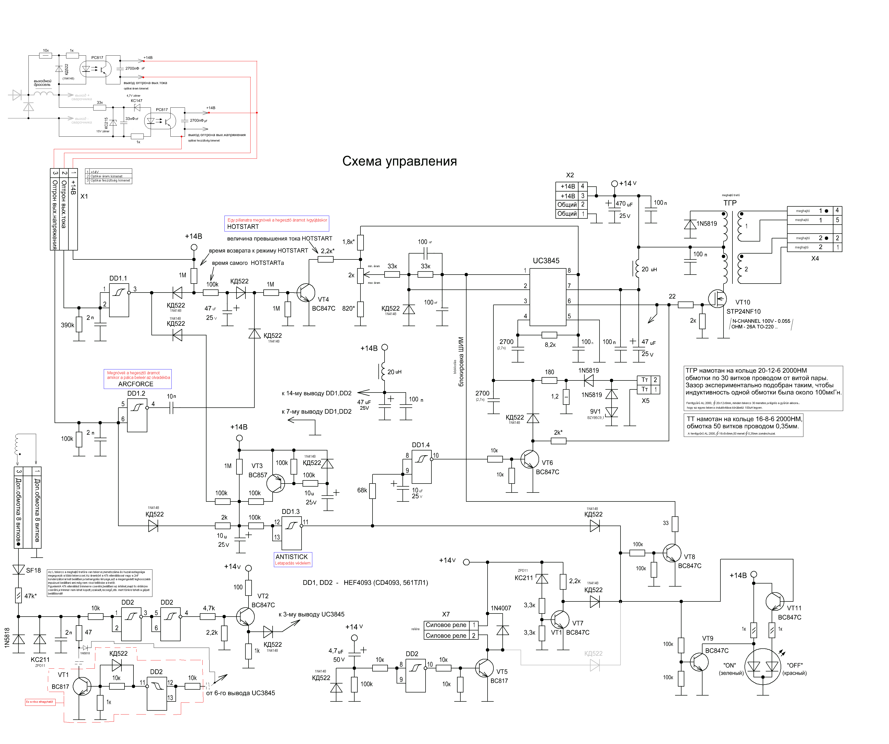 Felteszem az eredeti rajzot is és a megvalósított részletet is,ez utóbbiban csak 1 CD4093 van.Potmétert egyik sem tartalmaz az UC eredeti potiján kívül.Többek között azért is írtam,hogy nem tudom hogyan és mennyire valósítja meg azt a bizonyos jelleggörbét.Kérem Tőled és Mindenkitől a kielemzést.A fordítás nem biztos,hogy pontos és szakszerű.Kérdéses részlet az eredeti rajzon alul lévő áramkör,ehhez is tartozik egy tekercs,de nem biztos,hogy az a meghajtótrafón van kivitelezve,vagy mittudoménmi.