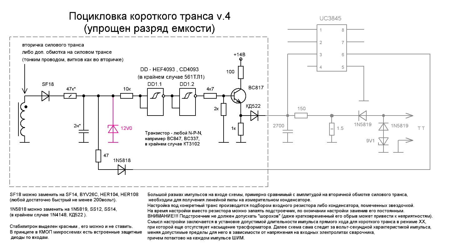 Felteszem az eredeti rajzot is és a megvalósított részletet is,ez utóbbiban csak 1 CD4093 van.Potmétert egyik sem tartalmaz az UC eredeti potiján kívül.Többek között azért is írtam,hogy nem tudom hogyan és mennyire valósítja meg azt a bizonyos jelleggörbét.Kérem Tőled és Mindenkitől a kielemzést.A fordítás nem biztos,hogy pontos és szakszerű.Kérdéses részlet az eredeti rajzon alul lévő áramkör,ehhez is tartozik egy tekercs,de nem biztos,hogy az a meghajtótrafón van kivitelezve,vagy mittudoménmi.