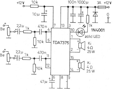 Ezek az IC-k 12-14.4V-ig érzik jól magukat. nem véletlen, hogy a katalógusban a 14.4V-on mért adatokat közlik(autós erősítő). EIAJ=Saturated square wave output Tehát az erősítőt 100%-ig kivezérlik négyszögjellel és ennek mérik a teljesítményét! Persze az más kérdés, hogy ezt lehet-e valamire használni, mindenesetre a katalógusban jobban mutat a 43W mint a 20W! Mivel nem négyszögjelet, hanem zenét hallgatunk rajta, az elméleti maximum 14,4V-on kb. 25W hídba 4 ohm-on. A valóságban kb. 20W szedhető ki belőle elfogadható torzítás mellett.