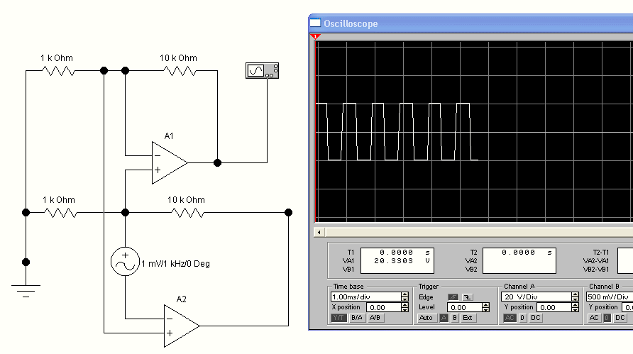 De van pozitív visszacsatolás. A vak is látja. Szerinted miért van, hogy A2 1mV-os hibájától az egész rendszer túlvezérlődik? Mert a hibajelre nézve végtelen az erősítés!
