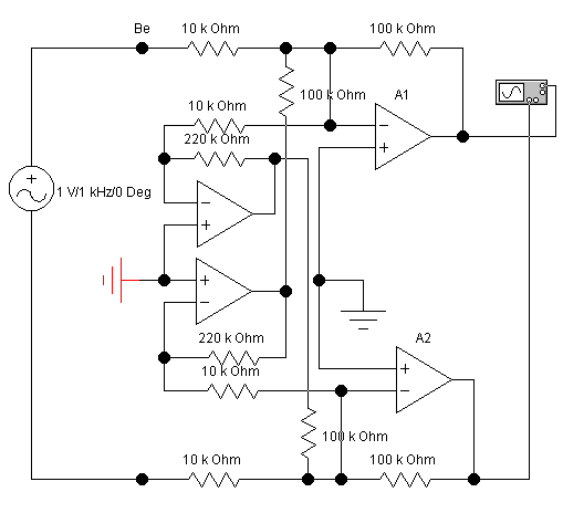 Most már ki lett iktatva a káros pozitív kör. A hibajelkioltás A2-re nézve tökéletes. A 10mV-os 1Khz-es kimeneti hibából kevesebb, mint 1uV marad. Ennél meg az a baj, hogy A1-re nézve nem az...
