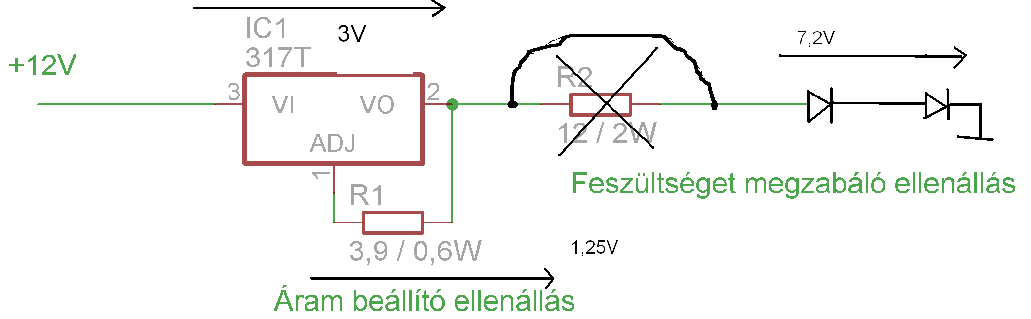 Egyéb tekintetben azt hiszem ezzel az összefoglalással teljessé vált a kép. Most már ki lehet próbálni, az IC-t a korábban említett tapogatásos módszerrel ellenőrizd és szükség esetén hűtést tegyél rá. Egyébként szerintem a sorosan kötött ellenállás sem hülyeség, csak itt nem lesz akkora maradék feszültség, hogy szükség lenne erre (elvileg 0,55V lesz, de a minimális 3V-tal számoltunk és kereken 12V-tal). Inkább egy kis hűtés.