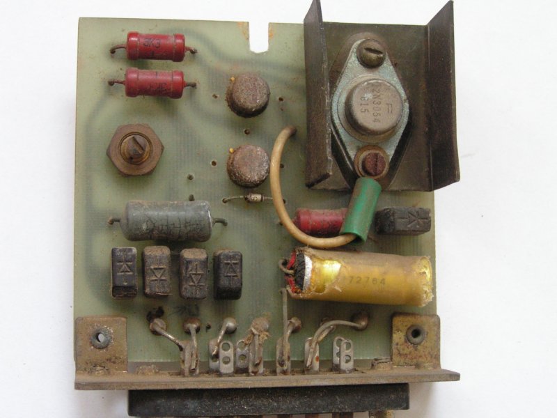 A szabályzó rész pedig pár trafóból és két panelből áll.A vélhetően szabályozó panel összesen pár darab félvezetőt tartalmaz amikből egyedül a 2N3054 tanyót tudtam beazonosítani.A másik két tranzisztor már nem leolvasható az oxidációtól.