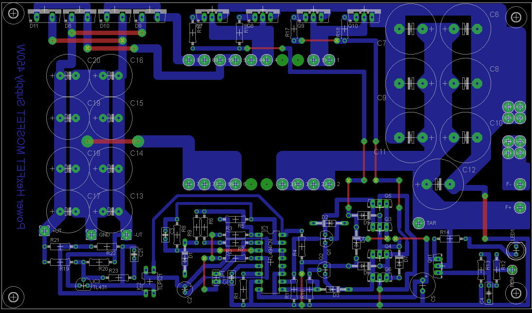 Nekem is lettek átkötések de nem a nagyáramú részeken,hanem a vezérlő áramköri részeken! Nehéz volt megtervezni úgy hogy a szabálynak megfeleljen! És próbáltam minél kisebbre de a szerelhetőségre is figyelni! Ha kész a végleges NYAK akkor felteszem, de így még nem akarom! Neked különben akkor van kétoldalas NYAKod ezek szerint, működik, mekkora teljesítményt szedtél ki belőle?