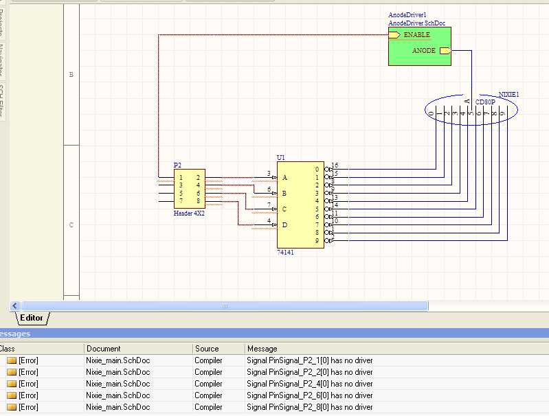 Tudom h a 74141-nek kell driver (mcu pin mondjuk..), de mivel egy nyákra rakom a nixiket meg a 74141et, másikon lesz a proci meg a többi cucc, ezért egy csatlakozót kötök a 74141re ezen a panelen. erre ez itt hibának veszi nekem :S ilyenkor mi van? h lehet kivédeni ezt ? a másik meg hogy a tranyó bekötésre miért panaszkodik az anód driver áramkörben ? nagyon nem értem én ezt.. hol a hiba, h javítsam ? Edga'r