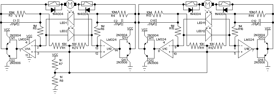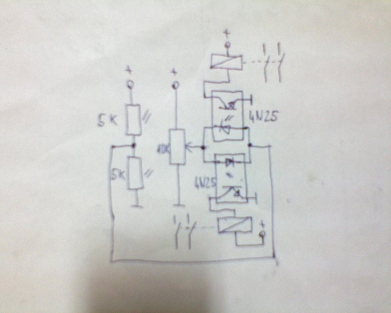 Sziasztok! Én a napkollektoromhoz találtam ki egy nagyon egyszerű kapcsolást. Nagyon megbízhatóan és nagyon pontosan beállítja a napra. Két fényellenállás érzékel benne (azokat rossz mozgásérzékelőből szedtem ki). A 4N25 optocsatolót bárhol lehet kapni. De ha mégsincs, akkor bármilyen optocsatoló megteszi. Iránytól függően a két relé közül meghúz valamelyik. A pontosságról pedig annyit hogy 2-3 percenként állítja a nap után, tehát akkora elmozdulást már érzékel. A fényellenállásokat egymástól egy panelból összeforrasztott T alakkal árnyékoltam le, úgy, hogy teljes megvilágításkor pont a fényellenállások felét takarja el. Egyforma értékű fényellenállások esetén pont közép állásba kell állítani a potmétert, azután fesz alatt lehet vele pontosra beállítani.