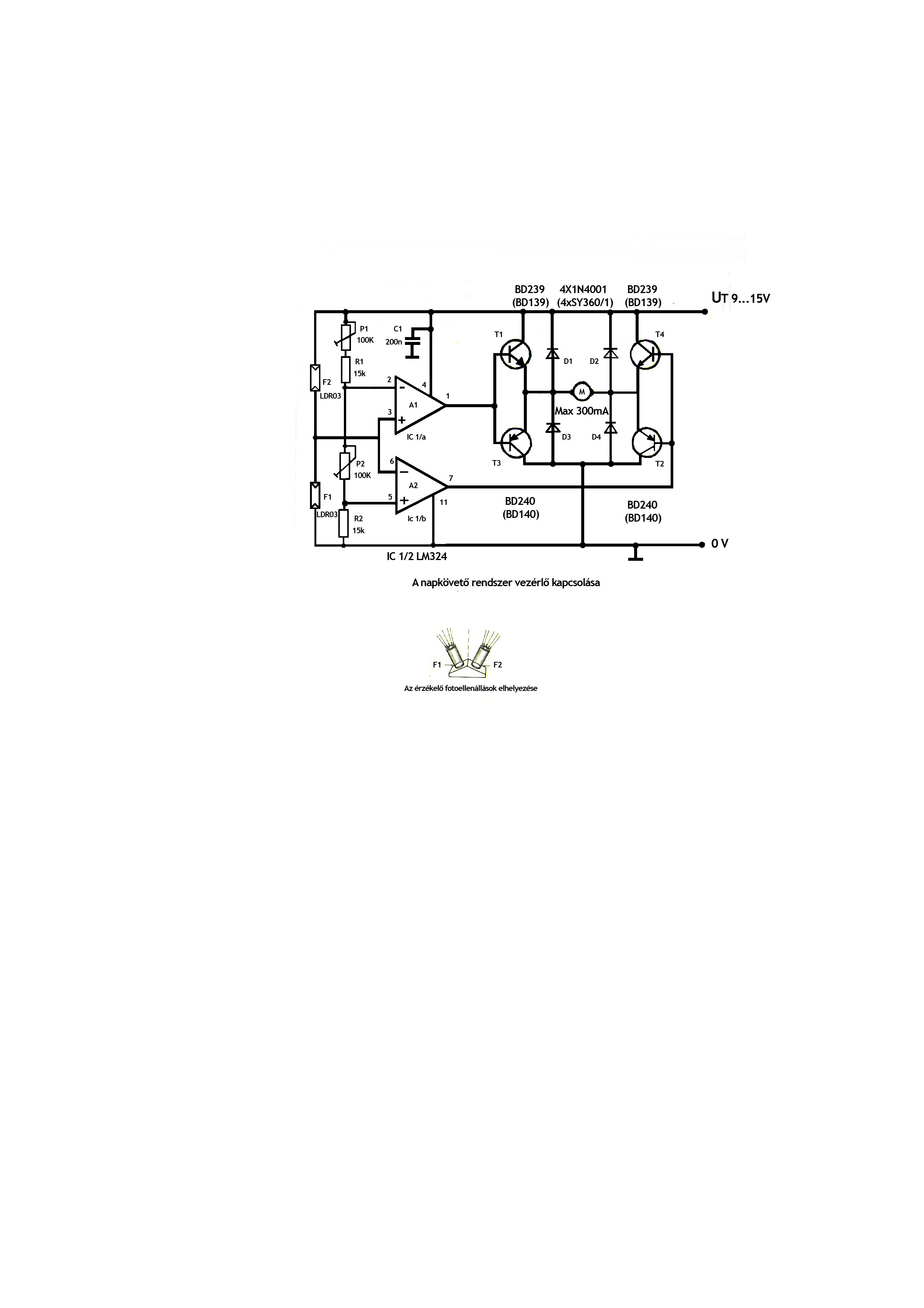 Én az alábbi rajzot építettem meg. Még nem szereltem fel az állványra, de működőképes. Motor helyére 2-2db relét tettem diódán keresztül. Kézben mozgatva szépen eldől melyik irány húz meg. Előnye hogy napfény szükséges a működéshez, lámpa fénye nem jó. Attila.