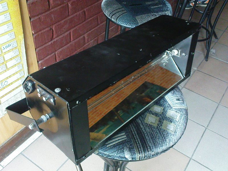 A vezérlő műszertáp csatlakozóval és rca kábelen kapcsolódik a stroboszkóphoz. Kaptt még hűtés is meg kontroll ledet. A vezérlő dobozkája alulemezből van ami fel van csiszolva, maga a strobi háza pedig redőnytokból meg alu profilokból készült.