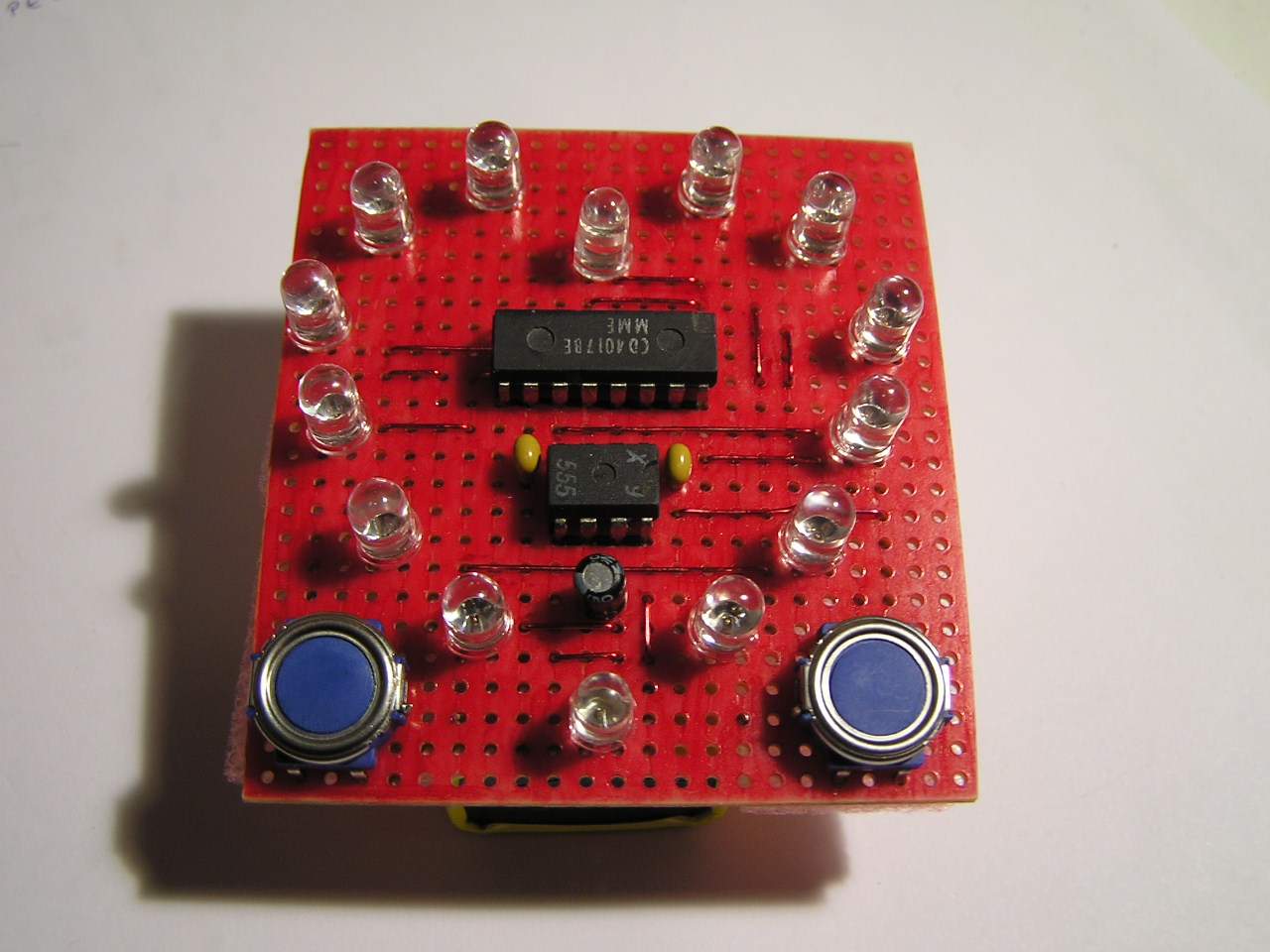 A számok oldalt, hogy a 4017-es melyik lábára kell kötni a led anódját.És a félkész panel. Működött is rendesen, alul a 9V-os elem, De dobozolás nélkül elég szegényen nézett ki, hiába festettem pirosra a panelt...