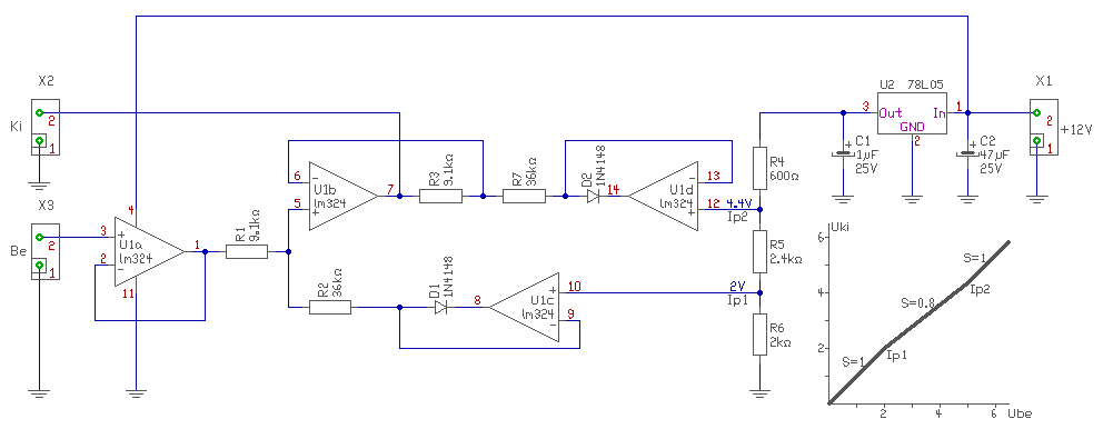 A kívánt erősítő. Ip inflexiós pont alatt erősítése egyszeres, felette az R4/R5 [Au=(R4/R5)+1] osztó határozza meg. A Ip feszültségét az R6/R7 feszültségosztóval lehet beállítani. (jelen kapcsolás mellett, kb. 1..3V tartományban) üdv! proli007