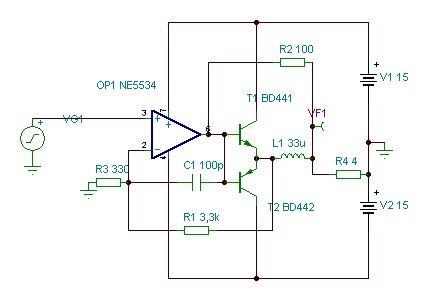 Persze lehet csökkenteni az IC terhelését, kisebb kondival és kisebb tekerccsel, de így könnyebb bemutatni a működést. Ez egy "current dumping" erősítő lett így. Röviden, a tekercs leválasztja végtranyókról a terhelést, és a magas frekik megkerülik azokat, így az IC, mint A osztályú erősítő közvetlenül hajtja a hangszórókat, de csak magas frekin. Azért, hogy könnyebb dolga legyen, integráljuk a jelet, azaz levágjuk a nagyon magas frekiket. normális esetben ez 100kHz felett történne, én itt most lekaszáltam mindent 20kHz felett. Ez nem biztos, hogy jó, mert így 0,01%-nál rosszabb lesz 20kHz-n, de az elv ismertetésére és meghallgatásra tökéletes így is.