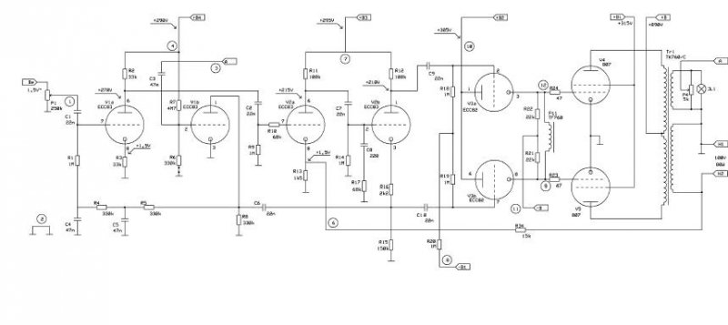 Van egy sejtésem, minek van ott az a fojtótekercs a két végcső rácskörében, de azért rákérdezek. Szerintem azért, hogy a két rácsot egyenáramúlag közösítse, de akadálytalanul lehessen vezérelni váltófeszültséggel. Máshol nem láttam még ezt a megoldást, így csak ráérzésből mondom, ami vagy jó, vagy nem. A szimmetria beállítást külön tápról oldja meg, a két 22 K-s ellenállásra csatlakozó potenciométerrel, ami a tápban van külön segédtekercsről jár.