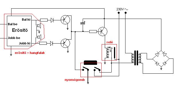 A képen látható egy kétáramkörös nyomógomb ami "bekapcsolná" a trafót, feltöltené a kondit ami nyitva tartja a relét ami a trafót "bekapcsolva" hagyja, amig meg nem szólal a zene vagy amég le nem merül a kondi és meg nem szakít a relé--->"kikapcsol a trafó". Lehet hogy érdekes gondolat és sokatok szerin felesleges is, de nekem szükségem lenne egy ilyen szerkezetre.