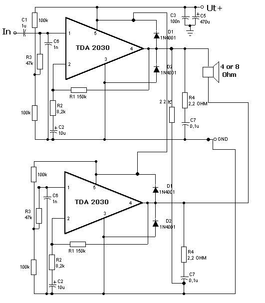 Aha, tetszik a kapcsolás, és az IC se túl drága, bár a 2×40W-ot 2ohmon adja le:S. Szóval nem tudom mennyivel jobb mint hídba a TDA2030, de kösz a kapcsolást!