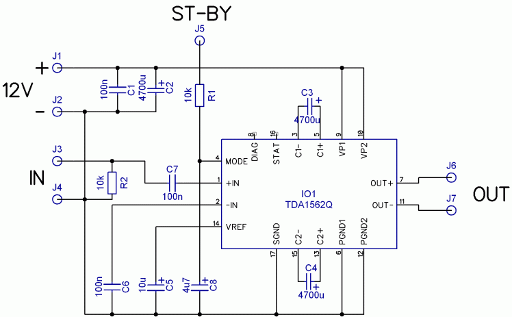 Aha, tetszik a kapcsolás, és az IC se túl drága, bár a 2×40W-ot 2ohmon adja le:S. Szóval nem tudom mennyivel jobb mint hídba a TDA2030, de kösz a kapcsolást!