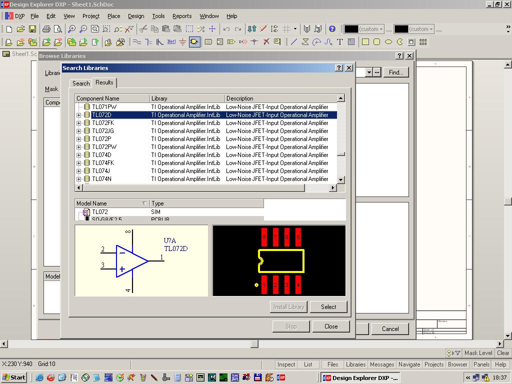 Másrészt ha nem adsz hozzá megfelelő könyvtárakat, akkor hiába van beixelve az "Available libraries" opció...és hogy melyik a megfelelő könyvtár? Olyan, amiben tutira létezhet ez az IC-típus...ehhez viszont nagyon sajnálatos módon meg kell nézned a neten, hogy mely yártók gyártanak/gyártottak Tl072-t...bemész a gyártó könyvtárába (pl. Texas Instruments), ott kiválasztasz megfelelő alkatrészkönyvtárakat...pl. a 7-szegmenses kijelzők között hiába keresteted, ott semmilyen módon nem fogja megtalálni...épp ezért felkeresed az Operational amplifiers, vagy vmi hasonló IntLib-et, és hozzáadod az alkalmazható könyvtárakhoz...na, így már 100%, hogy találni fog ilyen IC-t.