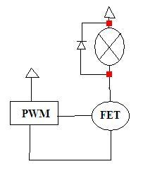 A hiba az volt,hogy az eredeti kapcsolásban(ld.melléklet) a FET-t és a PWM-t egy panelra tettem.A piros négyzetek kivezetéseket jelölnek,hogy a kapcsolást más fogyasztókkal is ki tudjam próbálni.Na most a gond az volt,hogy én a felsőre kötöttem a Graetzből lejövő + ágat,így azt a dióda lezárta. És már értem hogy önmagában miért nem használják lámpa dimmerként azt a graetzest kapcsolást.Bár az a meleg amit a FET leadott a hűtőbordának most jól jött a hideg műhelyben.°°D Még egyszer köszönöm a segítségeket mindenkinek,minden jót!