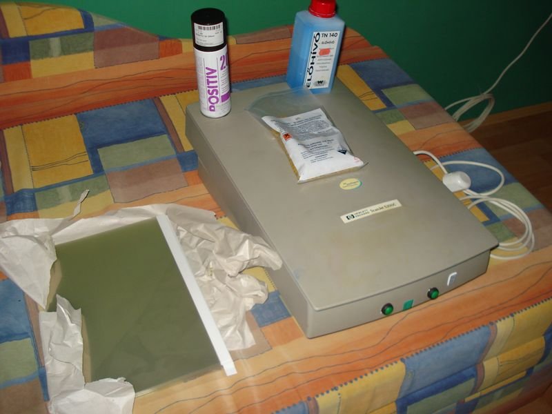 A nyákot megtisztítás után befújtam POSITIV20-as lakkal, majd hajszárítóval kb: 5 percig szárítottam. Ezután elhelyeztem a panelt és a maszkot a levilágítóba 1 perces levilágítási időt állítottam be, majd TN140-es előhívóval előhívtam. Egy műanyag tálkába annyi vizet engedtem, hogy a panelt éppen ellepje, és ehhez öntöttem kis előhívót, felkevertem majd tesztként beletettem egy másik kisebb panelt hogy ellenőzizzem a keverékemet. Mikor láttam, hogy jó akkor tettem bele a kimarandó panelt.